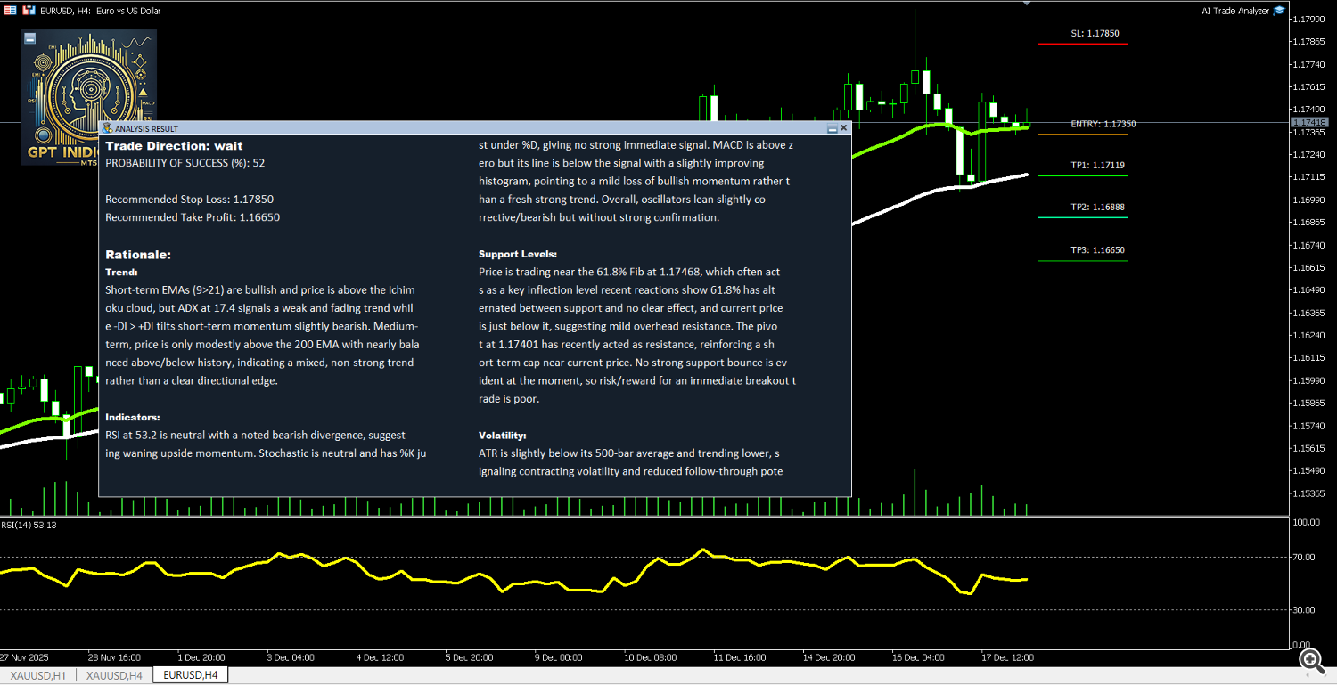 AI Commerce Analyzer suggests a wait / no-trade situation with a 52% chance of success, which means the setup has no robust edge proper now. Quick-term EMAs (EMA9 > EMA21) and value above the Ichimoku Cloud preserve a mildly bullish bias, however ADX round 17 signifies a weak and fading development. RSI is impartial close to 53 with indicators of bearish divergence, whereas MACD stays above zero however stays beneath the sign line, reflecting a slowdown in bullish momentum. Worth is consolidating close to the 61.8% Fibonacci degree (~1.1747), which has acted like a blended zone somewhat than a clear assist/resistance. ATR is beneath its common, signaling contracting volatility and diminished follow-through potential. Total, danger/reward for rapid entries is weak — higher to attend for a clearer affirmation.