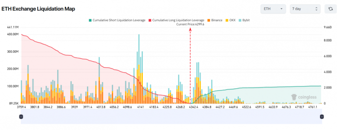 Coinglass information signifies that longs might lose over $5 billion if ETH drops 7% this week and falls beneath $4,000. In distinction, a 7% rise to $4,600 would set off $2 billion in liquidations for shorts.