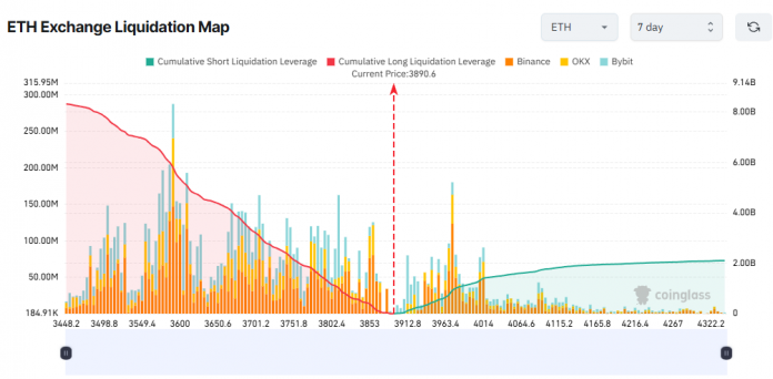 In keeping with Coinglass knowledge, if ETH breaks above $4,000, complete gathered brief liquidations may attain $1.2 billion. Alternatively, if ETH faces robust profit-taking and drops to $3,500, lengthy liquidations may soar to $7.8 billion.