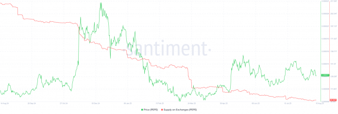 Santiment information exhibits that PEPE’s change reserves hit a one-year low on August 10 at 97 million PEPE. In distinction, this time final 12 months, greater than 215 million PEPE have been held on exchanges.