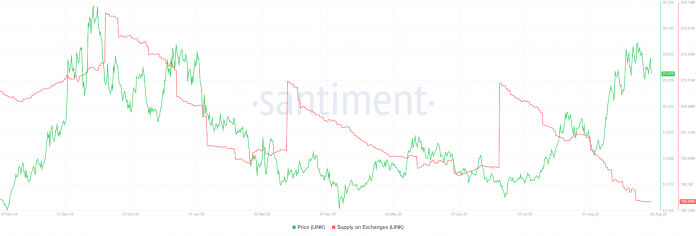 Santiment knowledge reveals Chainlink’s (LINK) trade reserves fell to a one-year low within the final week of August.