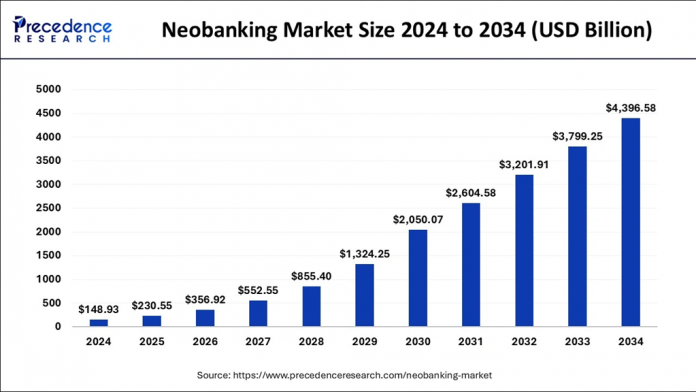 In response to a report from Priority Analysis, the worldwide neobanking market reached $148.93 billion in 2024. It’s projected to develop at a CAGR of 40.29% and hit $4,396.58 billion in 2034.