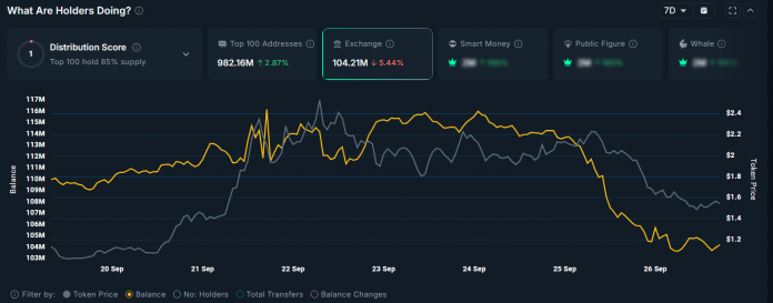 Nansen knowledge reveals that AVNT’s alternate reserves fell greater than 5.4% within the final week of September, dropping from over 106 million to almost 104 million. On the identical time, the reserves of the highest 100 wallets rose by 2.87%.