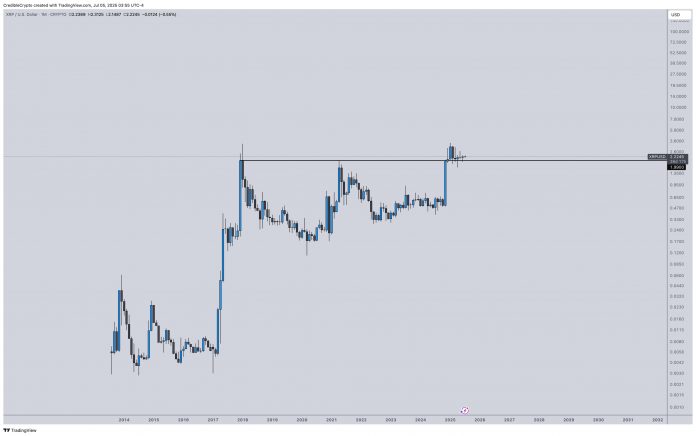 Pseudonymous analyst Credible tells his 469,500 followers on the social media platform X that XRP seems to be bullish on the excessive time-frame because it continues to construct a robust basis above $2.