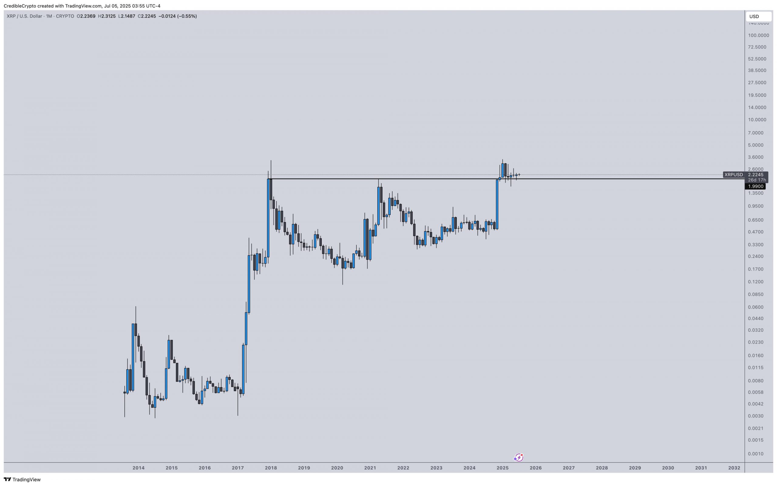In accordance with Credible, the $2 degree has stood as stiff resistance for XRP from 2017 to the tip of 2024, and now the altcoin is firmly holding it as assist.