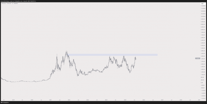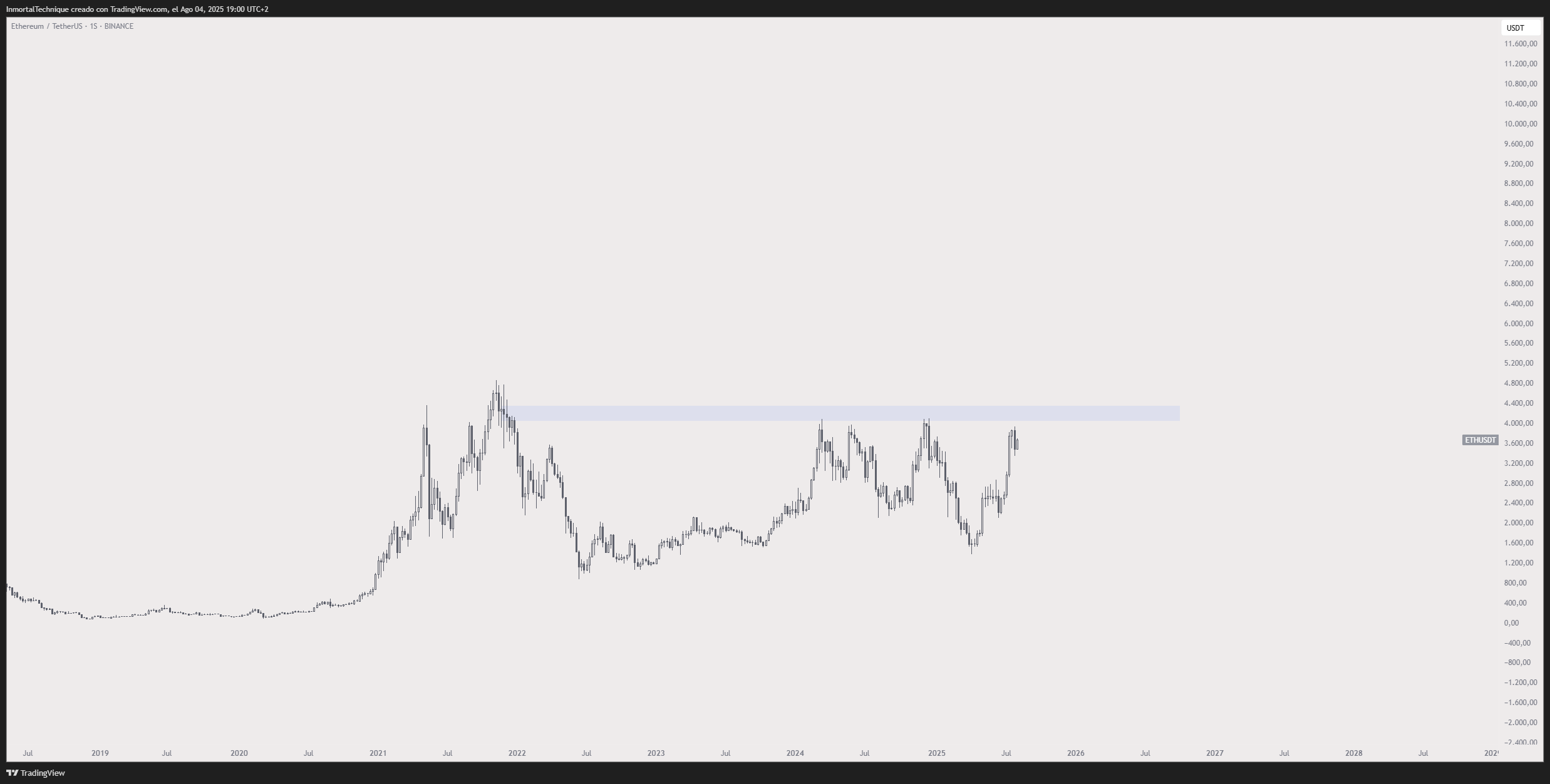 The analyst shares a chart suggesting that ETH has one ultimate resistance stage to breach at round $4,000 earlier than erupting to new document ranges.