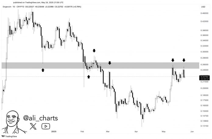 In a brand new thread, crypto dealer Ali Martinez tells his 138,500 followers on the social media platform X that resistance across the $0.26 degree is essential for the dog-themed digital asset.