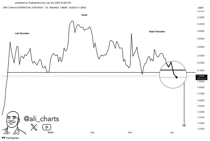 Martinez tells his 134,800 followers on the social media platform X that funds altcoin XRP (XRP) may plummet by round 37% from the present degree after forming a head-and-shoulders sample on the every day timeframe.