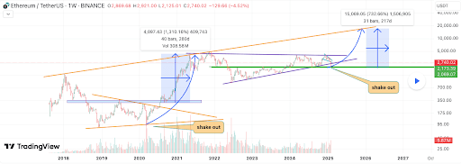 His chart exhibits that Ethereum has recorded a singular sample of shakeouts over the previous years, adopted by explosive upward strikes. On this context, a shakeout refers to a sudden drop within the worth of a cryptocurrency that forces weak gamers available in the market to promote their holdings earlier than the worth reverses and surges upward.