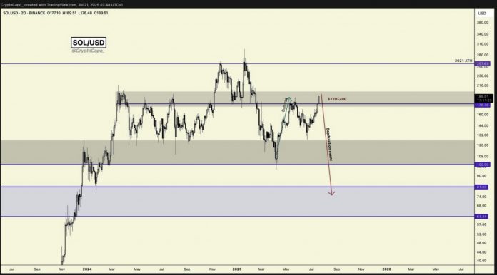 Pseudonymous analyst Capo tells his 129,129 subscribers on his Telegram channel that Solana (SOL) is dealing with resistance on the $200 degree and should decline greater than 68% from its present worth.