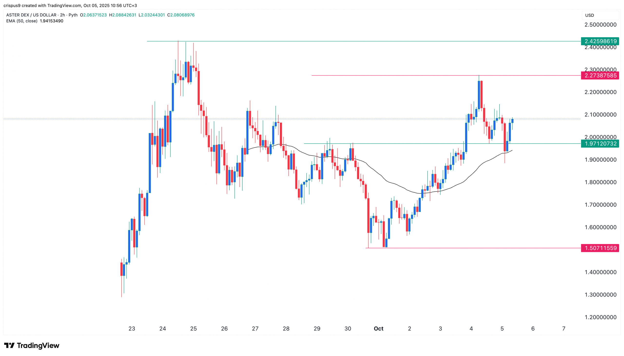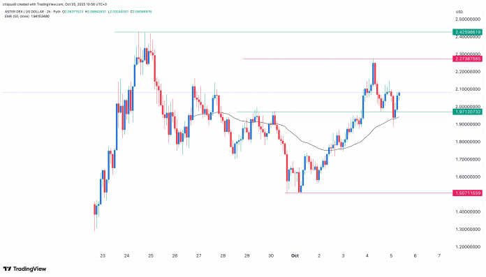 The 2-hour chart reveals that the Aster Coin value bottomed at $1.5070 on Oct. 1. It then bounced again and reached a excessive of $2.2738 on Oct. 4.