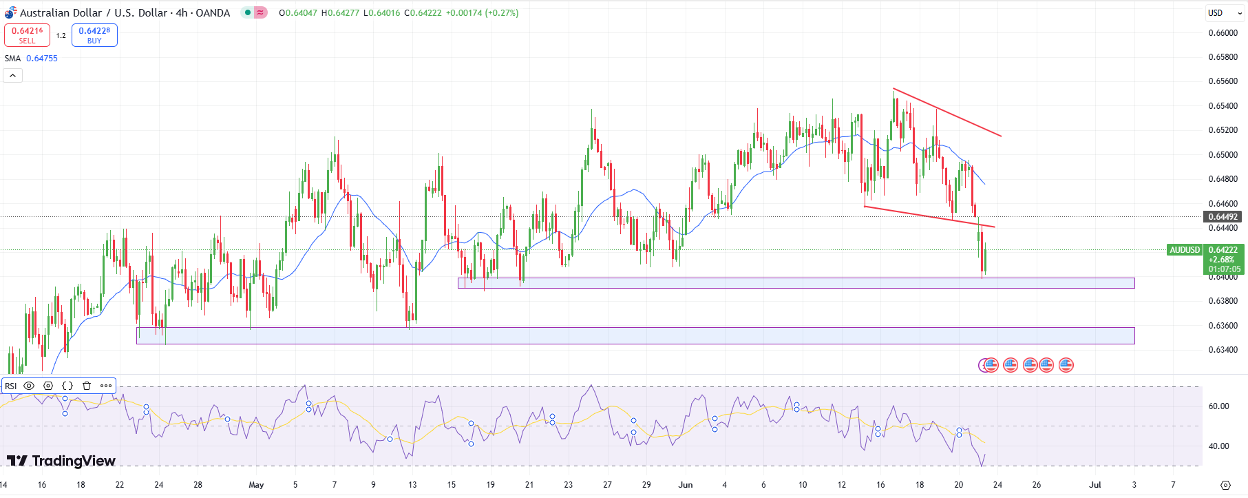 The surging oil costs amid rising world uncertainty following the US navy airstrikes on Iran’s three nuclear services over the weekend, triggered weak spot within the Australian greenback. President Trump confirmed that American B-2 bombers focused Fordow, Isfahan, and Natanz, in coordination with Israeli forces. Iran responded with a pledge of “eternal consequence” and authorised a measure to choke the Hormuz Strait. This motion might disrupt the oil provide and escalate the battle additional.