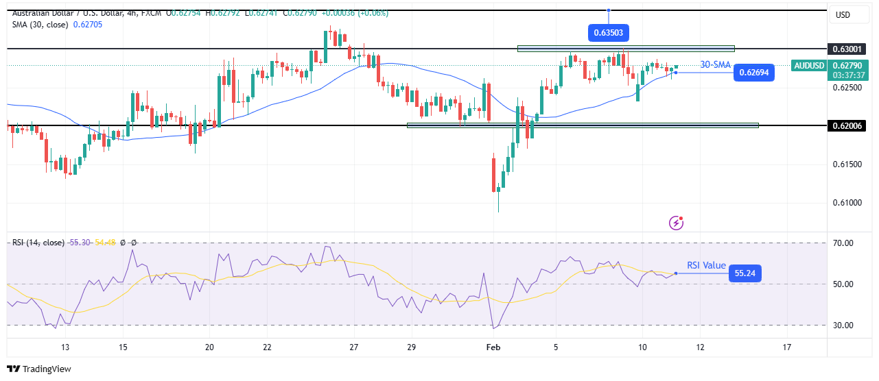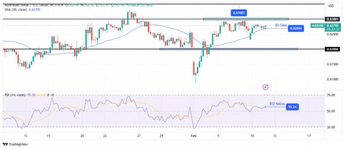 On the technical facet, the AUD/USD value trades above the 30-SMA with the RSI above 50, indicating a bullish bias. Nonetheless, the bullish development paused when the value met the 0.6300 key resistance degree. The pause led to a pullback to the 30-SMA help. Right here, bulls resurfaced, able to push the value to a brand new excessive.