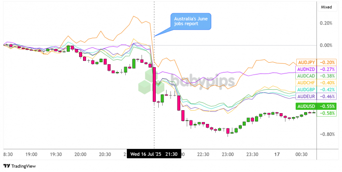 A number of hours after the report’s launch, AUD is down 0.58% to the U.S. greenback and 0.42% in opposition to the British pound. The Aussie managed to maintain its losses restricted in opposition to NZD (-0.27%) and JPY (-0.20%).