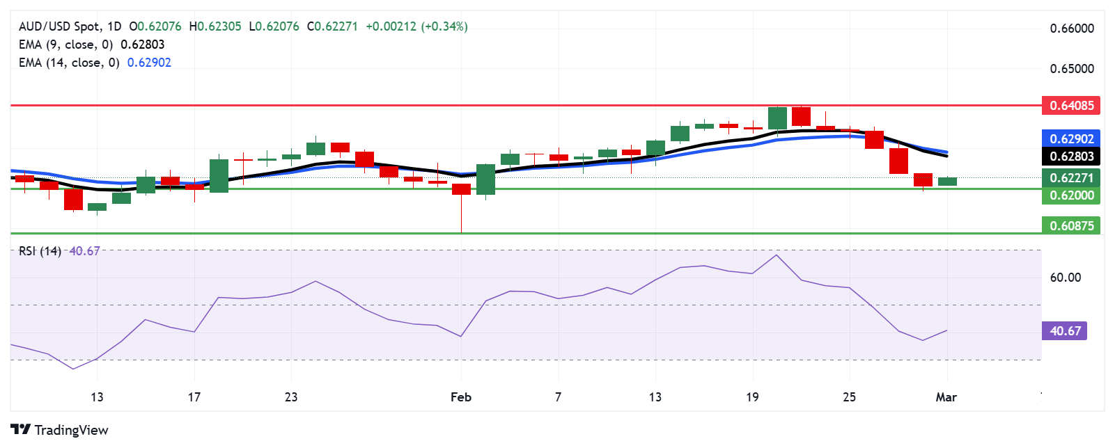 The AUD/USD pair is buying and selling round 0.6220 on Monday. The day by day chart evaluation means that the pair stays beneath stress, buying and selling under the nine- and 14-day Exponential Transferring Averages (EMAs), indicating weakening short-term momentum. Moreover, the 14-day Relative Power Index (RSI) stays under 50, reinforcing the bearish outlook.