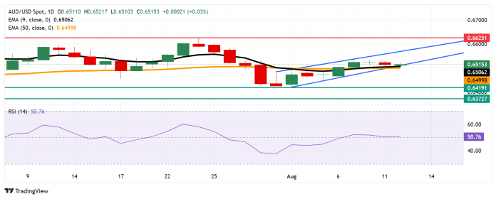 AUD/USD is buying and selling round 0.6510 on Tuesday. Technical evaluation on the day by day chart suggests a weakening of bullish bias because the pair checks to interrupt beneath the ascending channel’s decrease boundary. The 14-day Relative Energy Index (RSI) is positioned on the 50 stage, suggesting a impartial market bias. Additional motion will point out a transparent directional development. Nevertheless, the pair continues to be remaining above the nine-day Exponential Transferring Common (EMA), signaling that short-term momentum continues to be stronger.