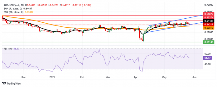 AUD/USD is buying and selling round 0.6440 on Wednesday, with a prevailing bullish bias. The technical evaluation of the every day chart signifies that the pair is remaining throughout the ascending channel sample. Nevertheless, the short-term value momentum weakened because the pair moved under the nine-day Exponential Shifting Common (EMA). The 14-day Relative Power Index (RSI) stays barely above 50, suggesting upward momentum is in play.