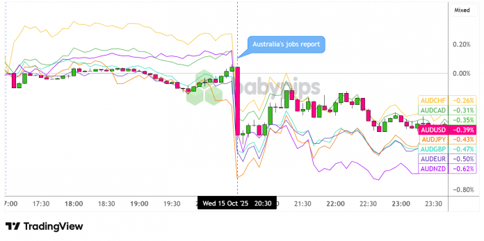 The Australian greenback, which had been shifting largely sideways previous to the roles report, tanked sharply upon seeing weaker than anticipated figures general as merchants doubtless priced in stronger odds of an RBA rate of interest reduce subsequent month.