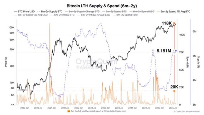 In accordance with prime analyst Axel Adler, Bitcoin’s newest take a look at of the all-time excessive at $118,000 confirmed a really completely different habits in comparison with previous cycles. Throughout this transfer, long-term holders (LTHs) who’ve been holding cash between six months and two years engaged in some profit-taking. Information reveals their seven-day common spending climbed to twenty,000 BTC. Nonetheless, this stage is way under the standard distribution spikes of earlier cycles, the place spending usually surged to between 40,000 and 70,000 BTC.