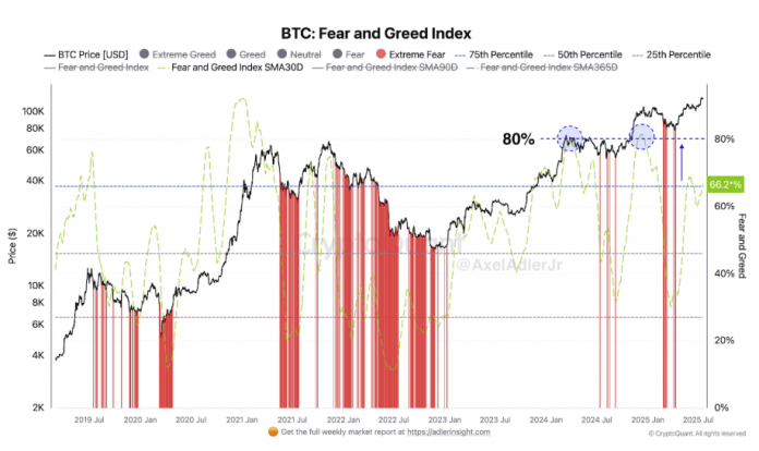 The present 66% studying, whereas within the inexperienced stage, suggests there’s nonetheless room for bullish sentiment to develop earlier than the market enters a euphoric blow-off part. In essence, this metric exhibits that if Bitcoin continues to consolidate and push greater with out the sentiment getting into into excessive greed ranges between 75% and 80%, it can proceed on a sustainable push to new heights.