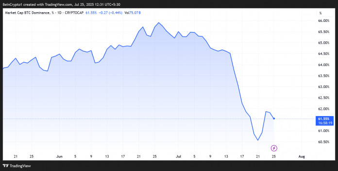 This expectation comes because the timing aligns with a steep decline in Bitcoin dominance. This index fell from 64% to 60% between July 17 and July 21.