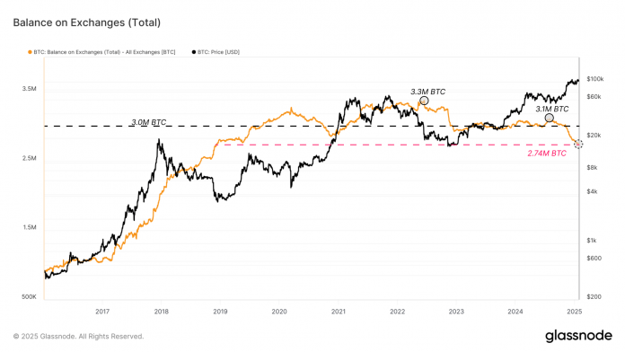 Now, right here is the chart for the Bitcoin Steadiness on Exchanges shared by the analytics agency within the report: