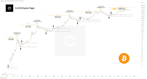 Now, utilizing this similar method within the ongoing cycle, CryptoCon projected that the subsequent main step for Bitcoin is someplace between $170,000 and $180,000. Significantly, the 5.618 Fibonacci extension factors to a “Golden Quantity” of $184,181 for Bitcoin’s value on this cycle.