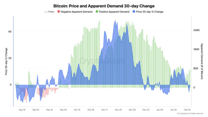 Amid this turbulent worth motion, key metrics spotlight a crucial relationship between Bitcoin’s efficiency and demand progress. CryptoQuant’s Head of Analysis, Julio Moreno, shared insights on X, revealing that Bitcoin’s worth return is carefully tied to its demand progress. Moreno emphasised that slowing demand since early December has instantly correlated with diminished returns, underscoring the essential position of market participation in sustaining bullish momentum.