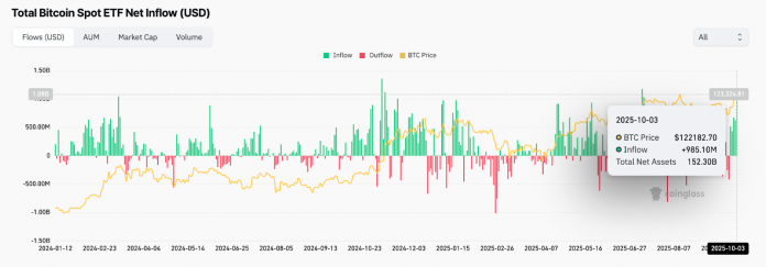 CoinGlass knowledge reveals roughly $+985.10M in web inflows as of right now, the second-largest since their January launch, coinciding with Bitcoin’s climb to contemporary information.