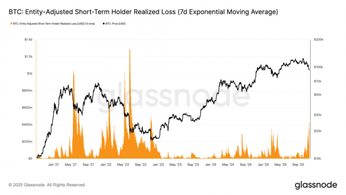 This downturn isn’t simply seen on the chart; it’s embedded in on-chain behaviour. Brief-term holders, sometimes essentially the most delicate cohort to volatility, are capitulating at among the quickest charges because the FTX collapse in 2022. Realised losses for these current consumers have surged to $523 million per day, underscoring how top-heavy the market had turn into within the $106K–$118K vary.