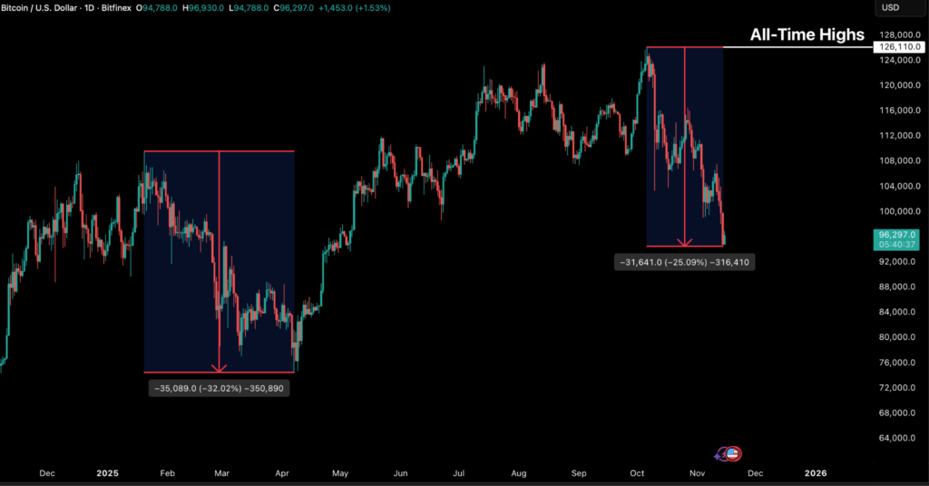Bitcoin has now logged its third-largest drawdown of the present cycle, falling 25 p.c from its all-time excessive to commerce under $94,000 and momentum stays in the direction of the draw back on decrease timeframes. Nonetheless, the present tempo of promoting and the dimensions of realised losses being skilled by traders has begun to stabilise, hinting that the market could also be getting into a consolidation part reasonably than an prolonged capitulation.