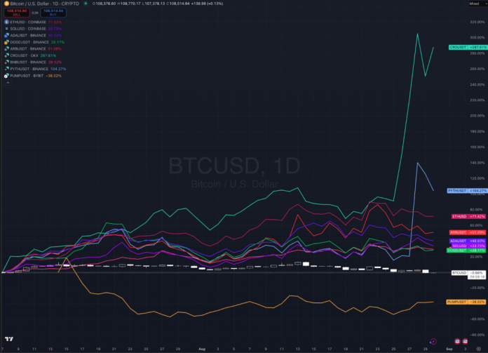 Altcoins have been faring worse, reflecting broad risk-off behaviour. ETH retreated 14 % after briefly posting new ATHs, whereas XRP, ADA, and DOGE noticed double-digit losses. But institutional demand stays resilient beneath the floor, with ETH treasuries and company patrons persevering with to broaden holdings. Mid-cap names like CRO and PUMP outperformed through narrative-driven rallies, although this rotation got here on the expense of weaker names, not new inflows.