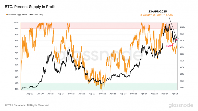 Bitcoin has now additionally reclaimed the Quick-Time period Holder Value Foundation degree at round $92,900, a essential on-chain pivot degree that usually separates corrective phases from renewed bullish momentum. Including to the constructive market construction, the P.c Provide in Revenue metric has additionally rebounded to 87.3 %, indicating enhancing market well being and investor profitability.