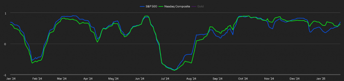 Hệ số tương quan Pearson 30 ngày giữa Bitcoin, S&P 500 và NASDAQ.