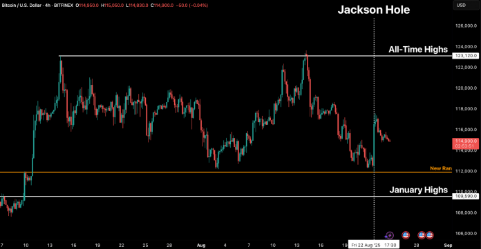 Because the annual Jackson Gap Financial symposium of central bankers received underway final week, Bitcoin was on the defensive, sliding practically 10 % from its highs as traders de-risked into weaker ETF flows and warmer inflation information. The tone, nonetheless, flipped sharply post-symposium after Fed Chairman Jerome Powell struck a dovish stability, sparking a brief squeeze throughout digital property that lifted majors and restored market confidence. Ethereum outperformed, surging to recent all-time highs, reaching $4958.70 on Sunday, reinforcing its rising position as a key liquidity driver for institutional demand, whereas continued BTC consolidation alerts a pause slightly than structural weak point.