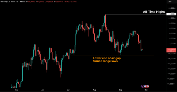 Bitcoin slid 5.1 p.c final week to shut at $109,690, breaking beneath key helps because the post-FOMC rally gave method to renewed promoting stress. Ether fell 10.1 p.c and Solana dropped 14.3 p.c, reinforcing the broad risk-off tone throughout majors. But, selective rotation into speculative altcoins endured, reflecting buyers’ continued seek for higher-beta alternatives whilst complete market capitalisation contracted 5.9 p.c on the week to $3.7 trillion, down 12.6 p.c from latest highs. Open curiosity additionally declined 13.7 p.c from its September peak, signalling a broad discount in speculative leverage.