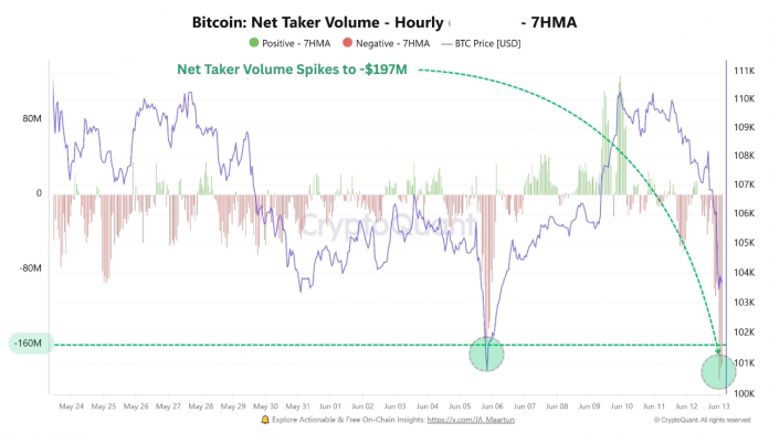Beneath the floor, dealer behaviour revealed mounting stress. Bitcoin’s Internet Taker Quantity plunged to –$197 million (see chart beneath), its lowest since June 6—signalling that sellers had seized management, aggressively offloading BTC at market costs. This promoting, nonetheless, mixed with a spike in liquidations, resembles previous capitulation—model setups that always mark native bottoms. If Bitcoin can maintain the $102,000–$103,000 zone, it might counsel that promoting stress is being absorbed and that the market might be primed for restoration—assuming geopolitical dangers don’t intensify additional.