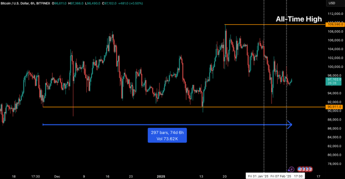Bitcoin đã đi ngang trong khoảng giá từ $91,000 đến $102,000 khi căng thẳng địa chính trị toàn cầu gia tăng, kéo dài giai đoạn tích lũy hiện đã vượt quá 75 ngày.