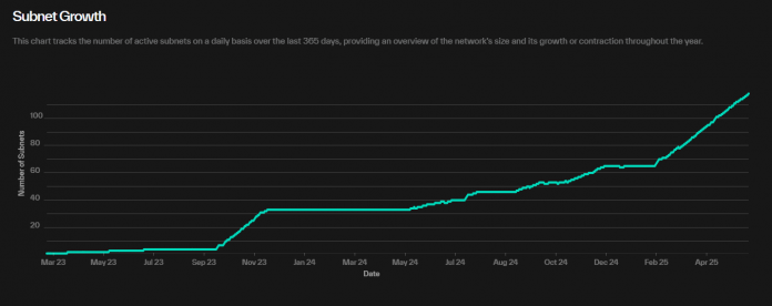 In keeping with knowledge from Taostats.io, Bittensor reached its highest-ever subnet depend with 118 energetic subnets as of early June 2025.