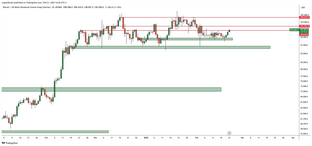 “We like what we see. For this reason I’ve been saying to simply chill. It takes an entire three every day candles to make the temper swing the opposite means once more. To me, $99,000-$101,000 is the final resistance earlier than new ATHs (all-time highs). Break that and we begin marching upwards once more.”