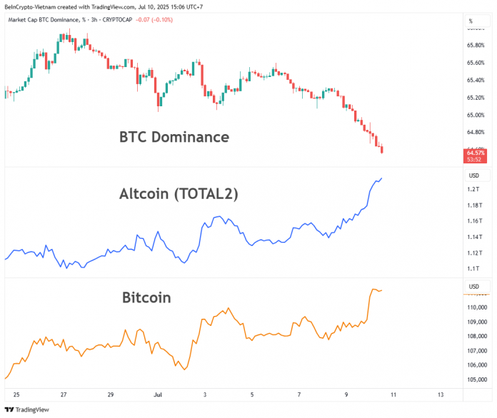 Notably, on July 9, when Bitcoin reached a brand new ATH above $111,000, BTC.D continued to fall. This means that altcoins are gaining market cap sooner than Bitcoin, a uncommon and long-awaited signal for altcoin buyers.