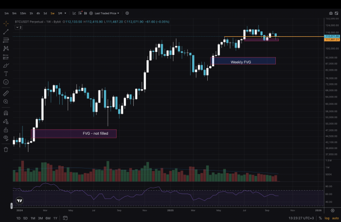 1W timeframe – a very good place to start! To not take too lengthy right here, we want to discover that in February of 2024 and April of 2025 there are Weekly Truthful Worth Gaps. Each stay unfilled. I might slightly say the 2024 is unlikely to get crammed throughout this bull market. And the upper the value holds above $100,000, the much less probably it turns into for the 2025 hole to be crammed.