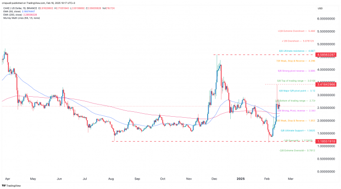 Due to this fact, the trail of the least resistance for the CAKE coin worth is bullish, with the preliminary goal being at $3.4185, its highest stage this week. A break above that stage will level to extra upside, with the subsequent level to observe being $4.5856, the double-bottom neckline and the final word resistance of the Murrey Math Strains device.