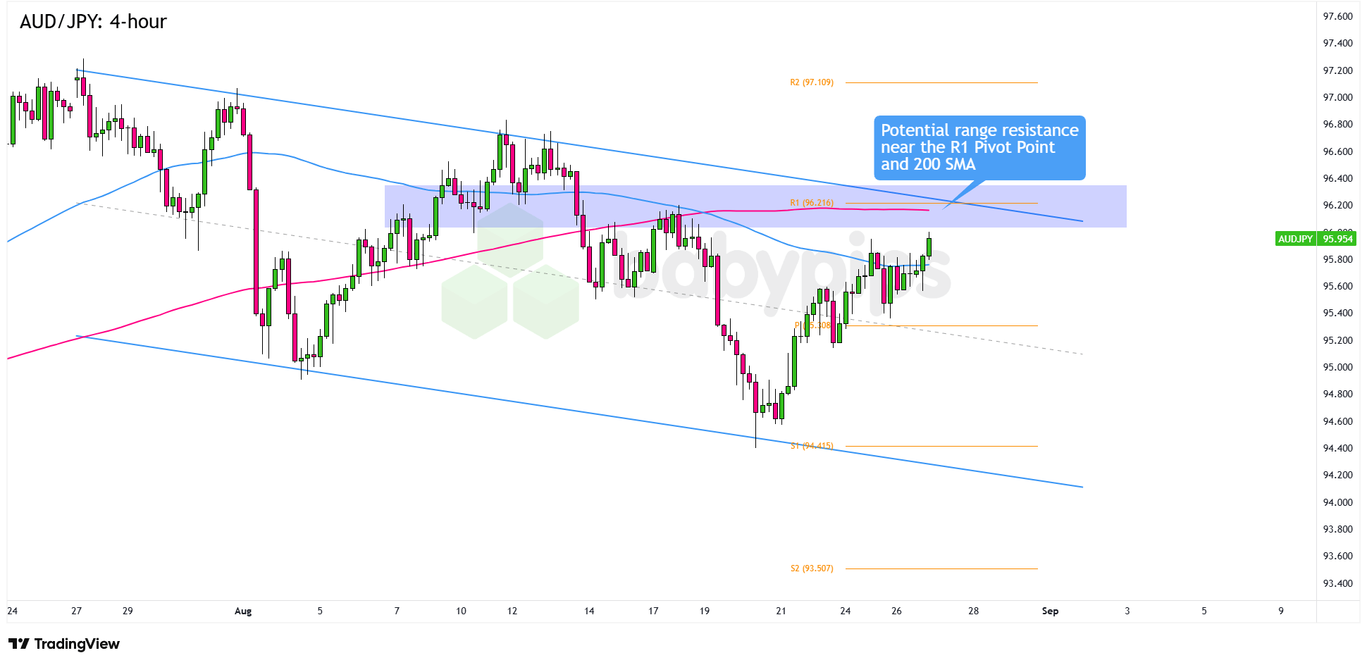 As you may see, 96.00 is correct across the R1 Pivot Level (96.22), 200 SMA, and the highest of a descending channel within the 4-hour chart.