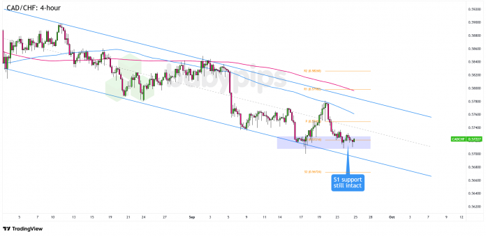 The .5720 space is doing a little heavy lifting right here, lining up with the S1 Pivot Level and the underside of a descending channel on the 4-hour chart.