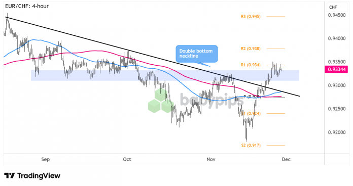EUR/CHF simply broke above its descending pattern line and seems to be climbing above its double backside neckline, too!