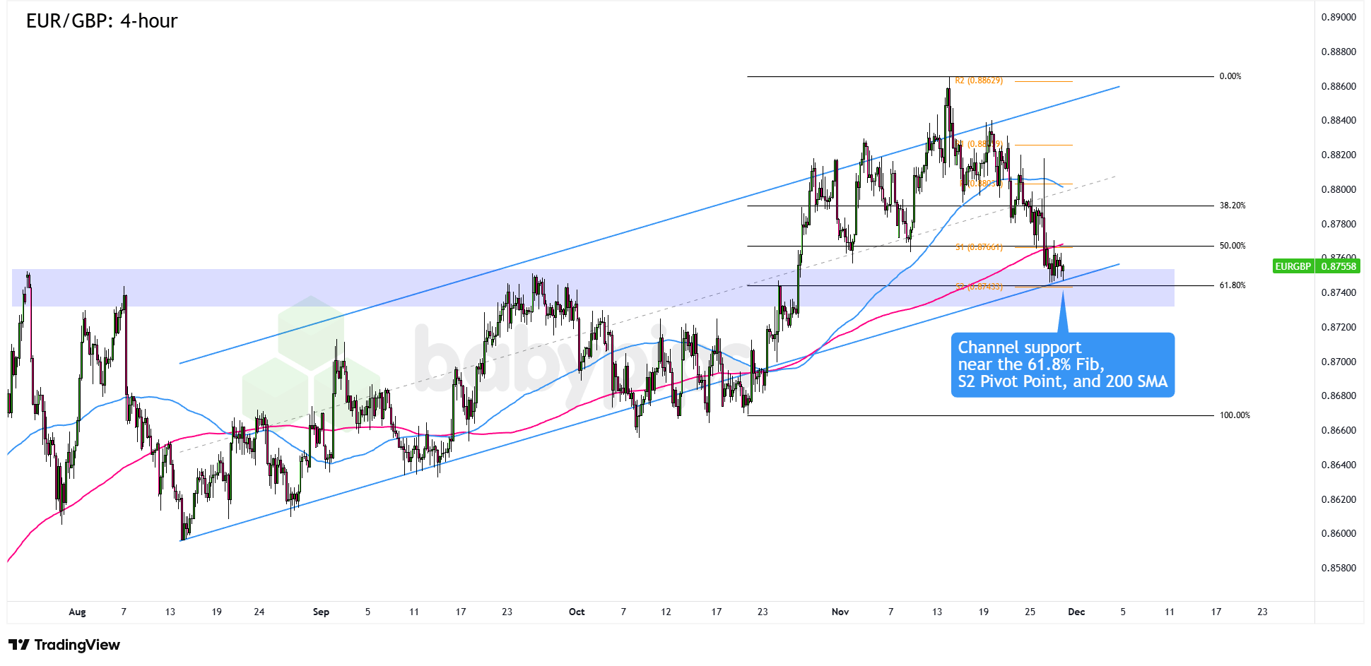 As you possibly can see, that stage traces up with the 61.8% Fibonacci retracement of the October upswing, the S2 Pivot Level at .8743, the 200 SMA, AND the underside of the uptrend’s help.