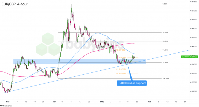 EUR/GBP has been in a downtrend since mid-April, however it seems to be prefer it simply bounced from the .8400 psychological degree.