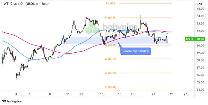 WTI crude oil might be getting exhausted from its climb, because the vitality commodity shaped a double high on its hourly chart.