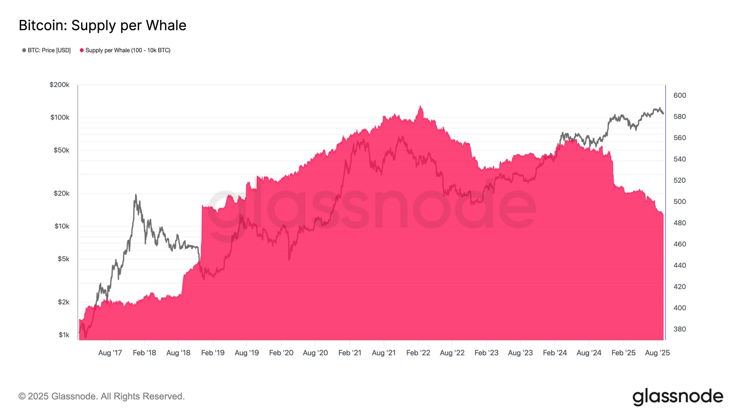 Immediately, the quantity of Bitcoin provide held by the common whale sits at simply 488 tokens, which is the bottom that it has been since December 2018, virtually seven years in the past.